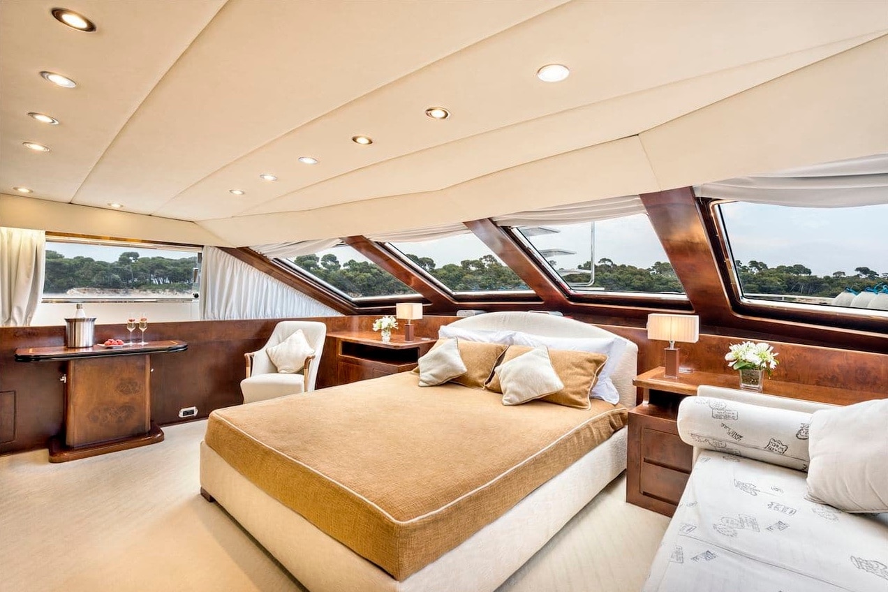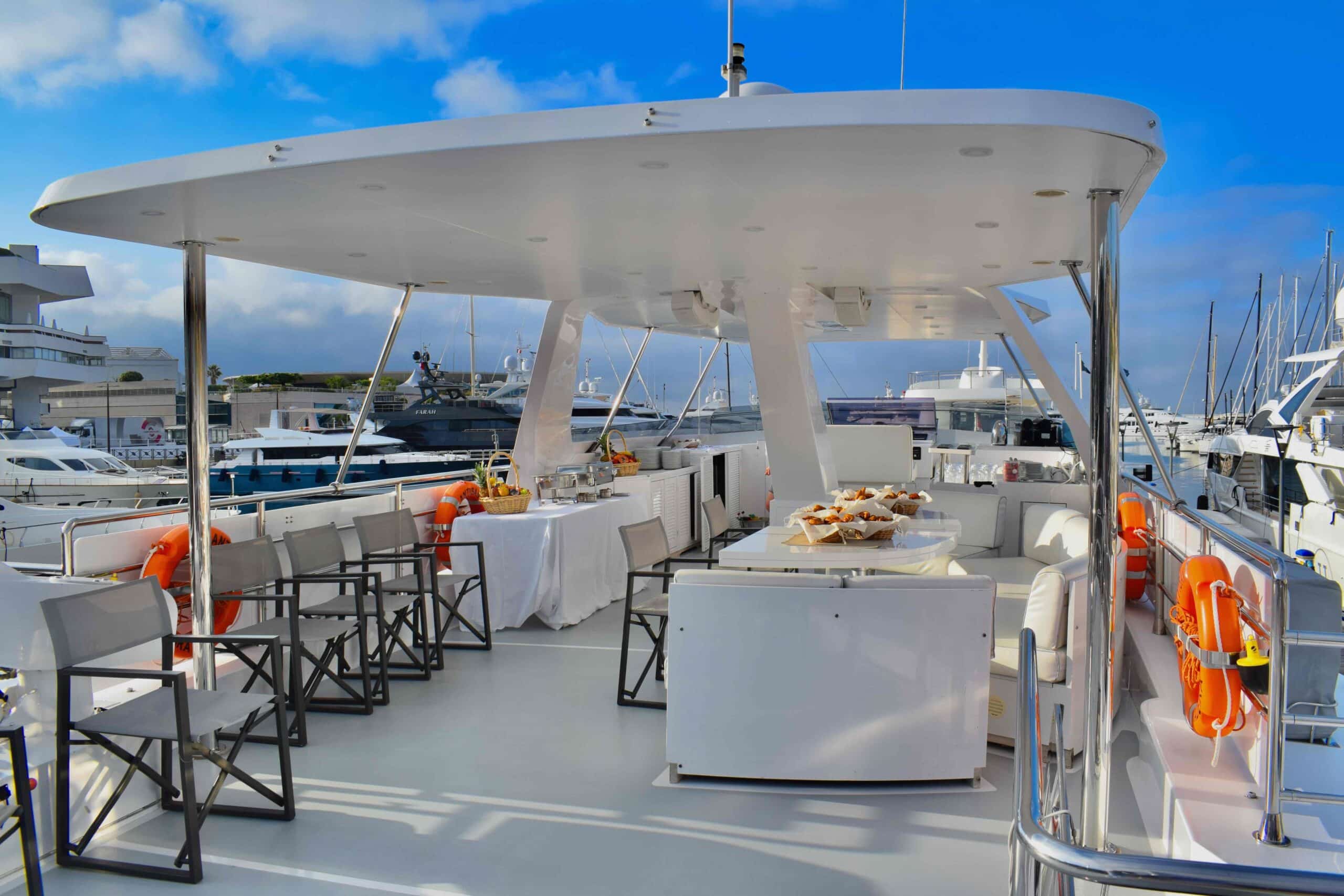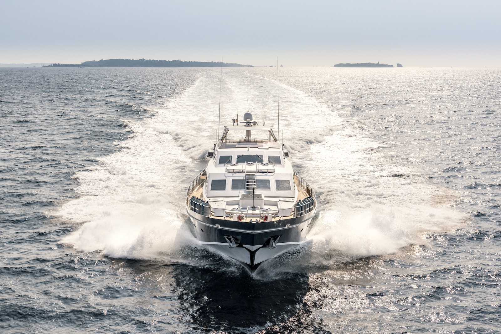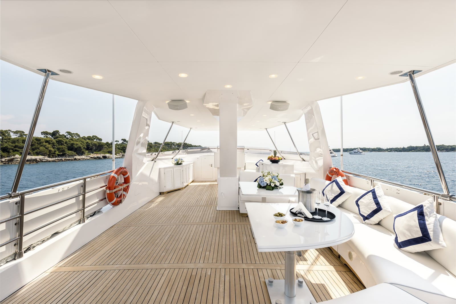 Well accustomed to business tourism, this yacht is equipped with an elegant tent to cover its flybridge, offering rare and spacious areas on a 33-metre vessel.