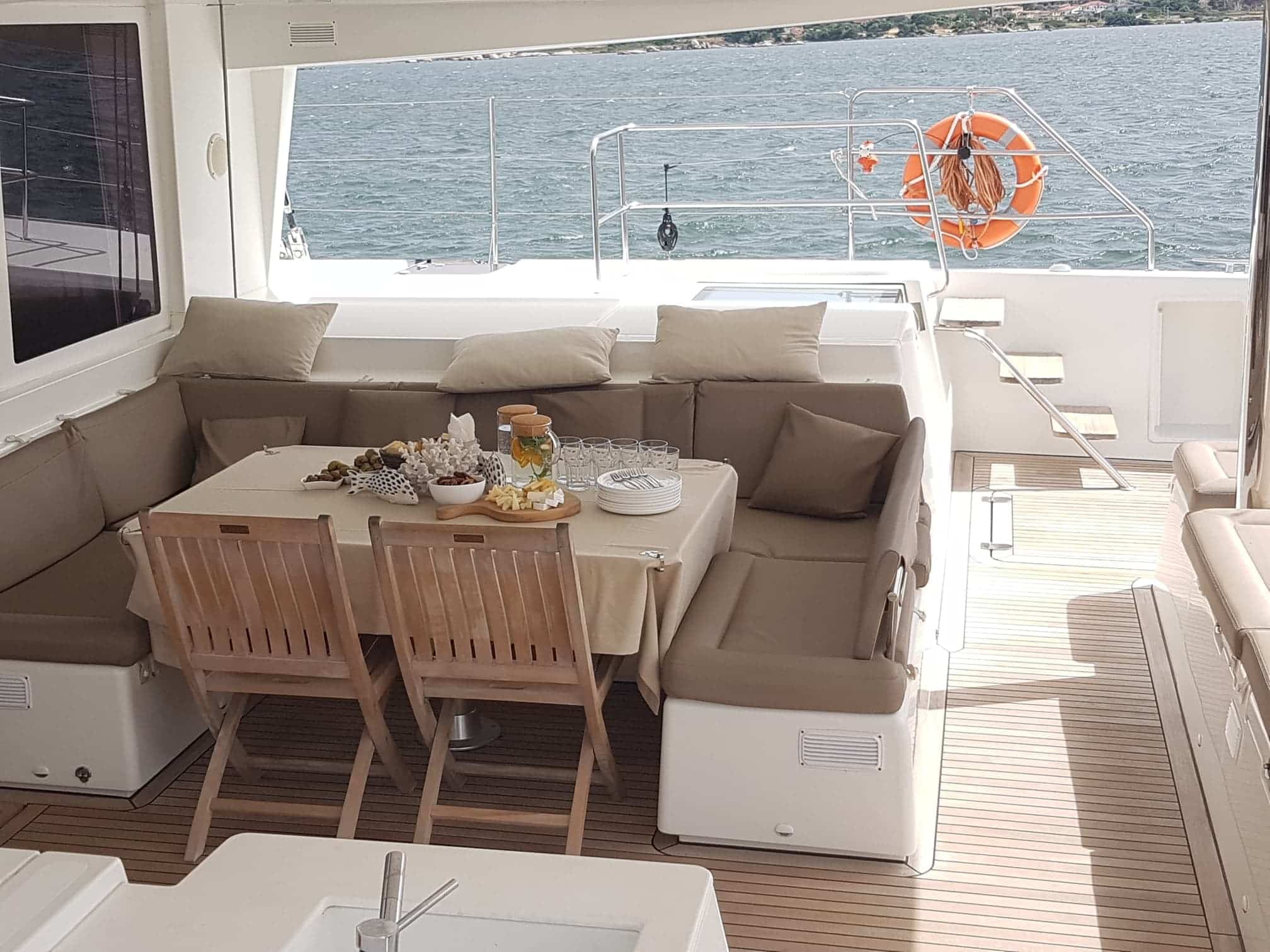 - Outside upper deck with awning and plenty of seating to enjoy the view while sailing