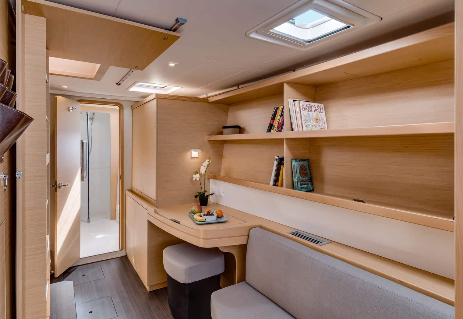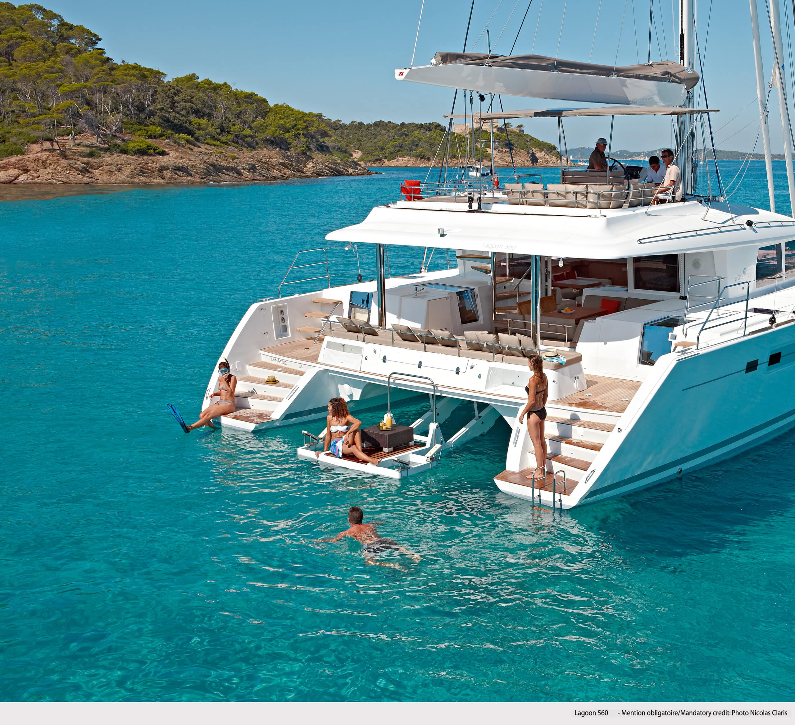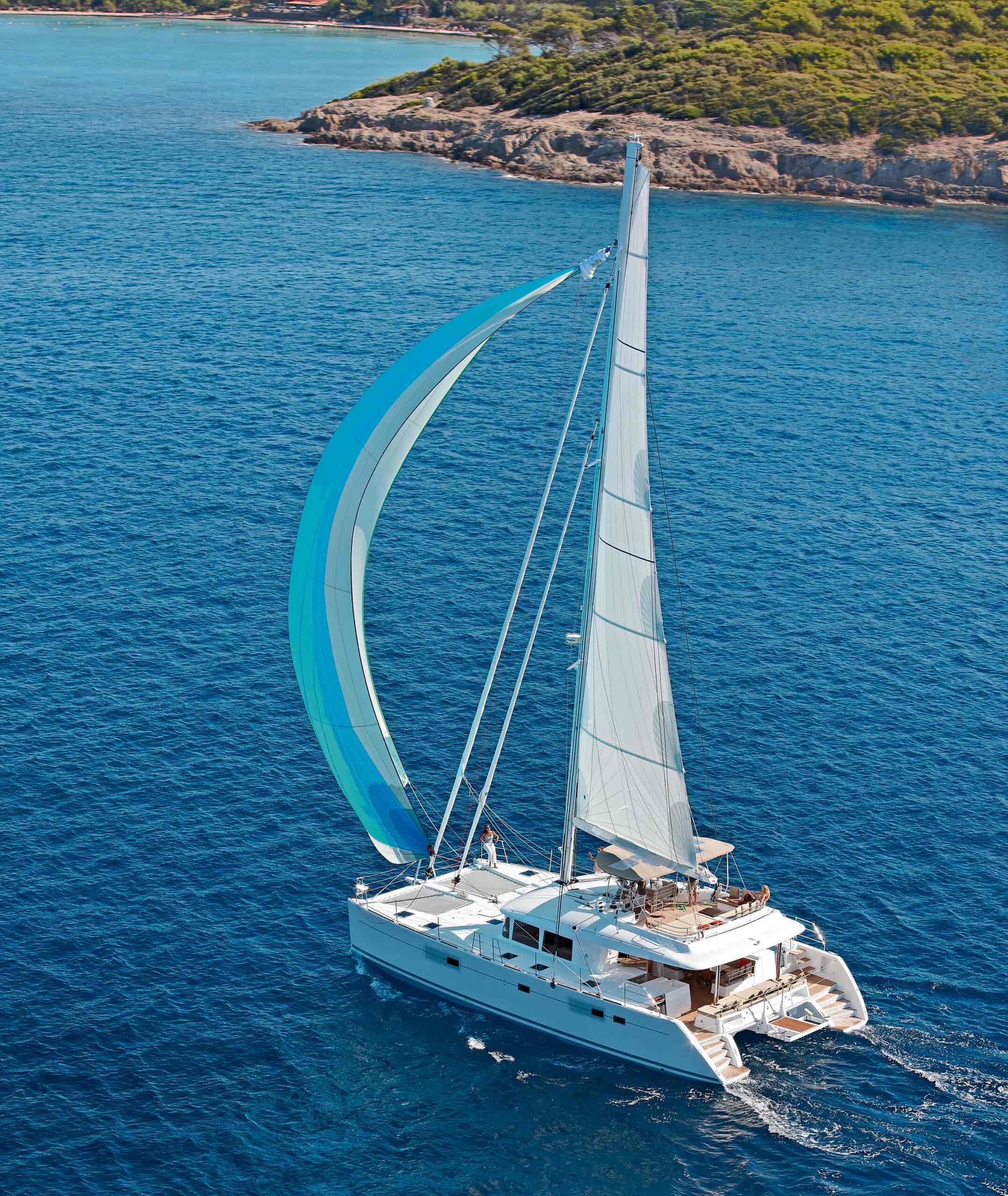 Very pleasant under sail, its many available spaces on board make it the darling of intermediate-sized groups looking for a comfortable and very well-equipped unit.