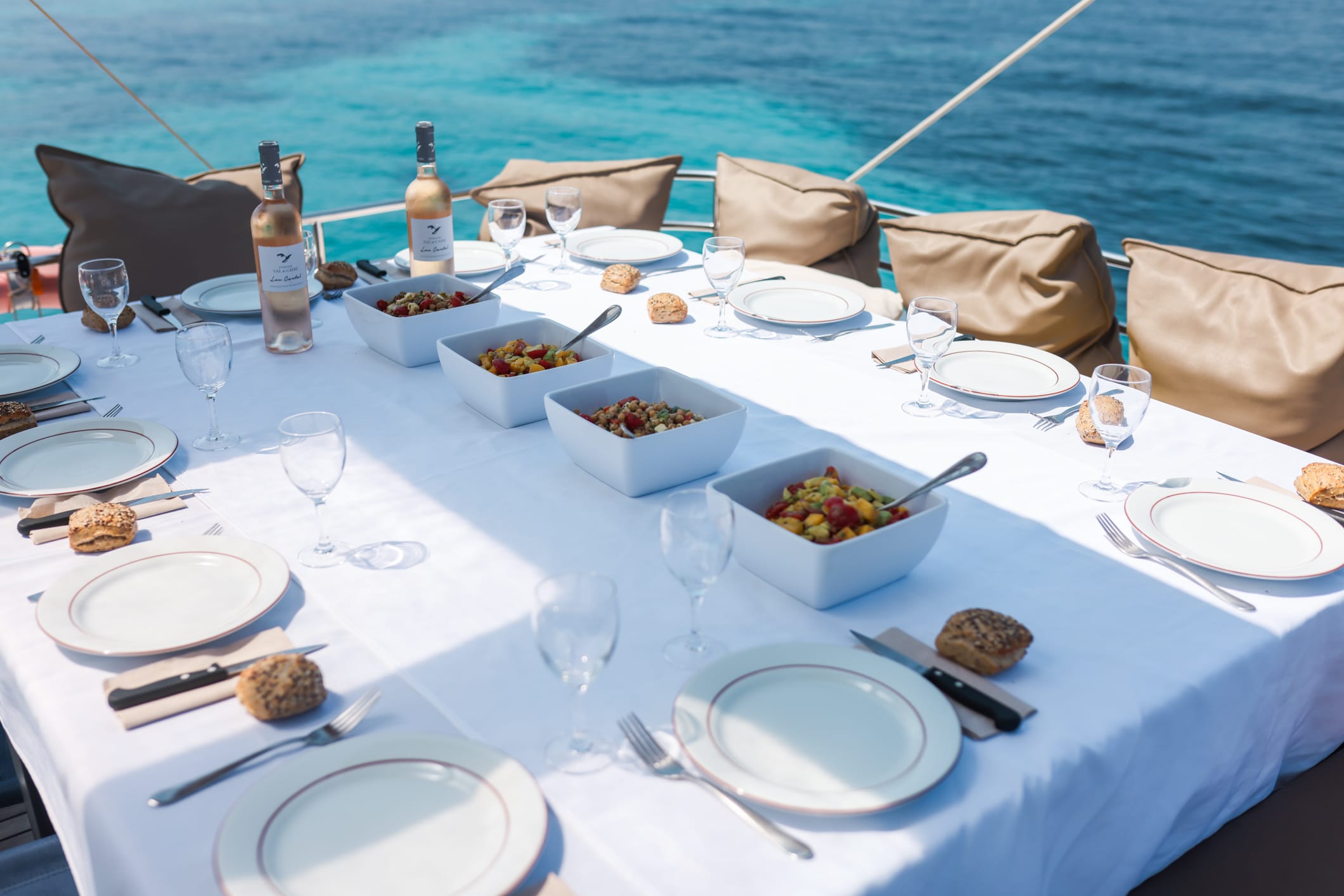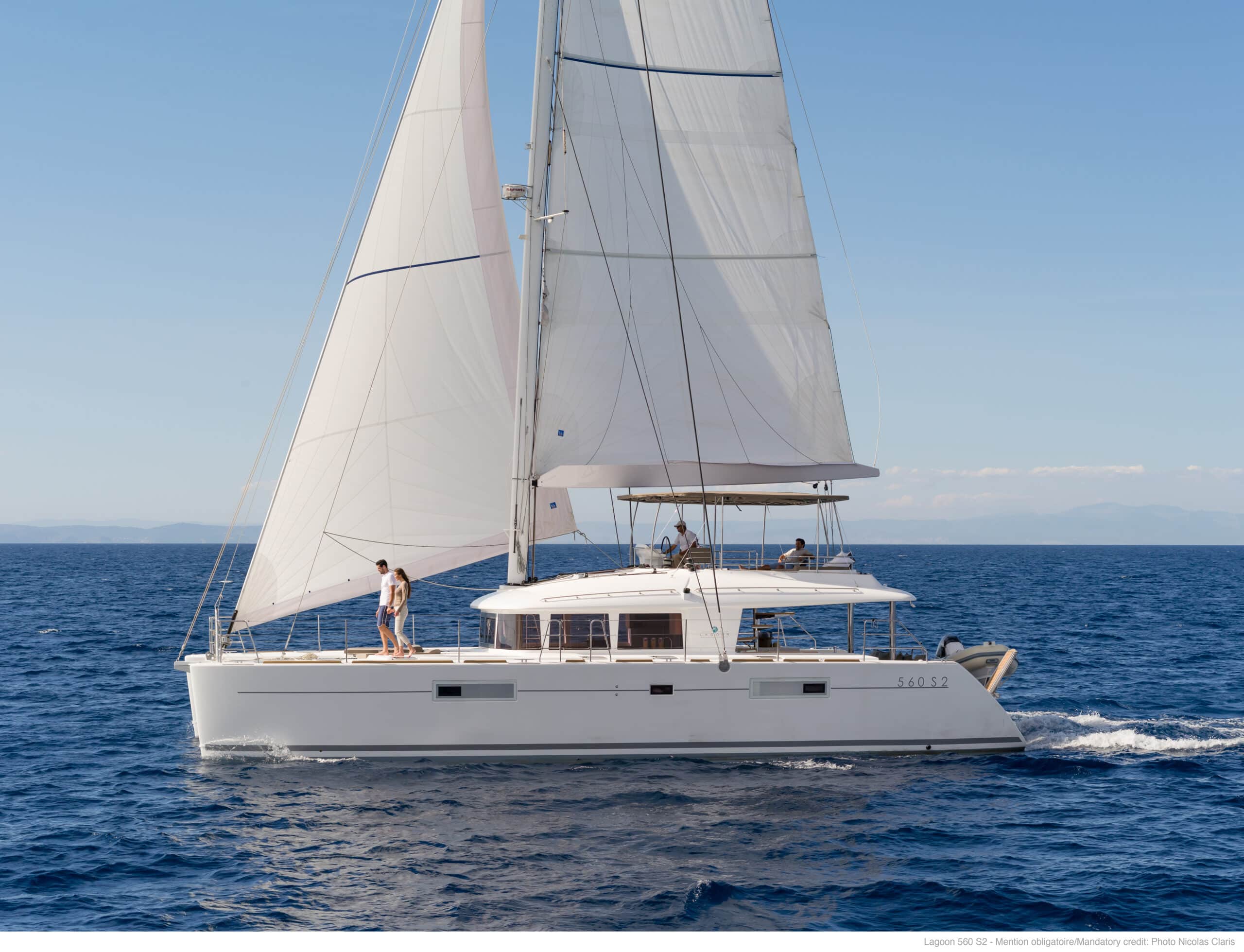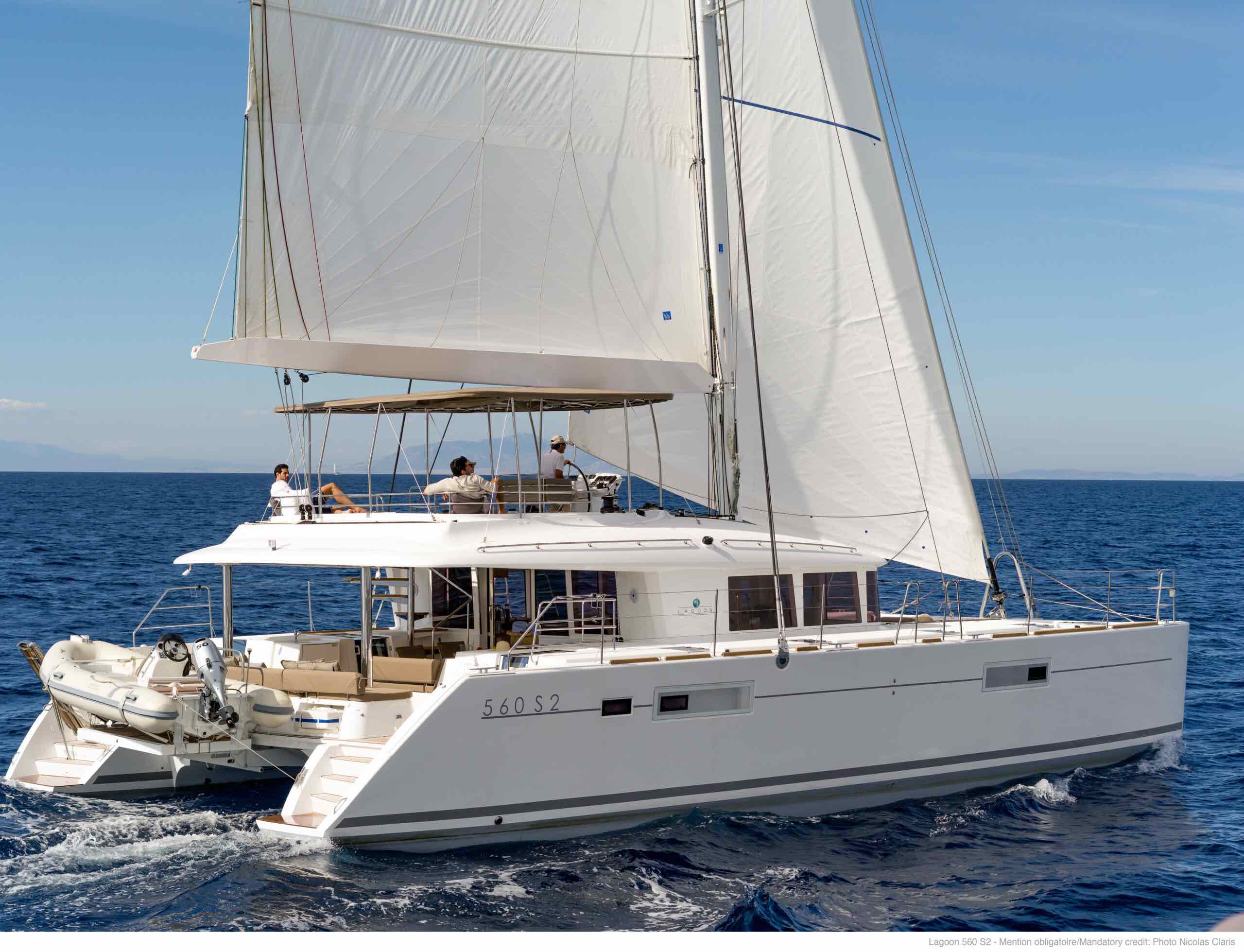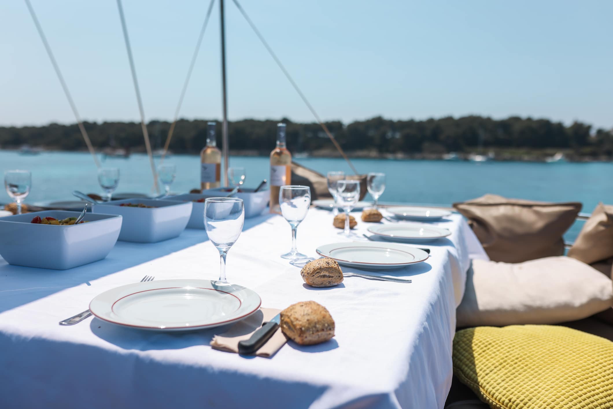 Very pleasant under sail, its many available spaces on board make it the darling of intermediate-sized groups looking for a comfortable and very well-equipped unit.