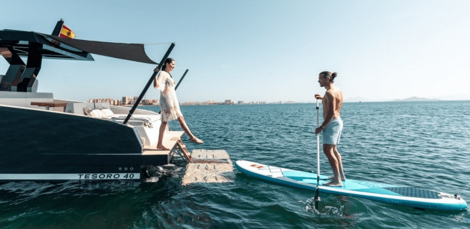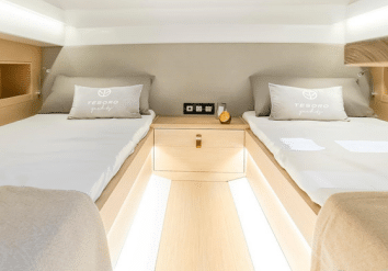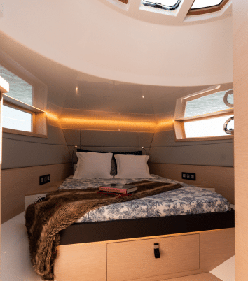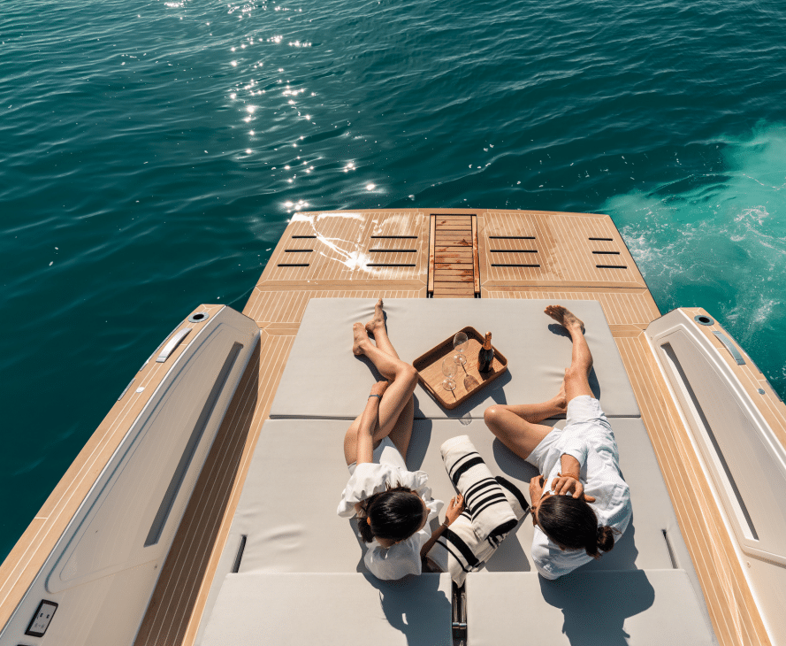 This boat is equipped with a hydraulic platform for access to the water, whether for swimming or water-based activities. Whether you like the sun or not, there are plenty of deckchairs aft and forward for sunbathing or relaxing in the shade thanks to a large bimini.
