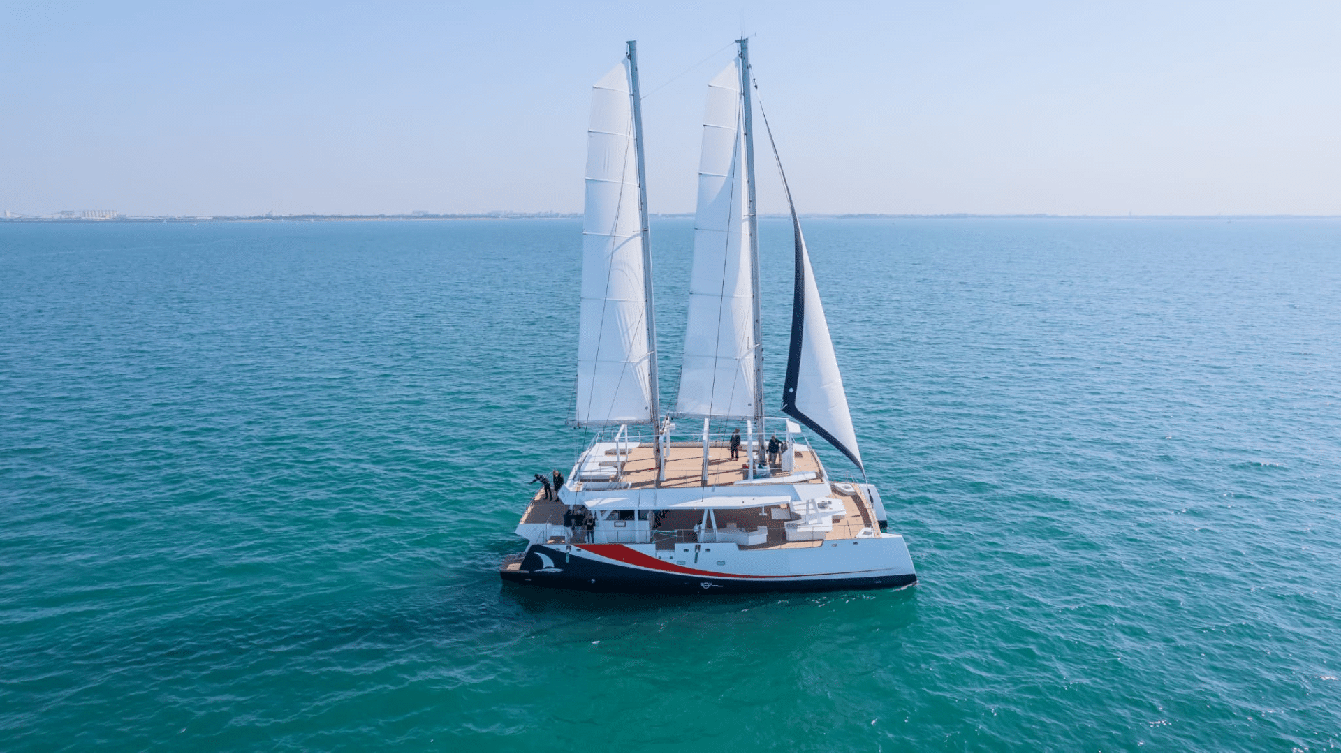 Ce catamaran de day charter premium est une unité XXL pour groupes XXL. Il combine le confort d’un yacht avec le charme d’une croisière à la voile