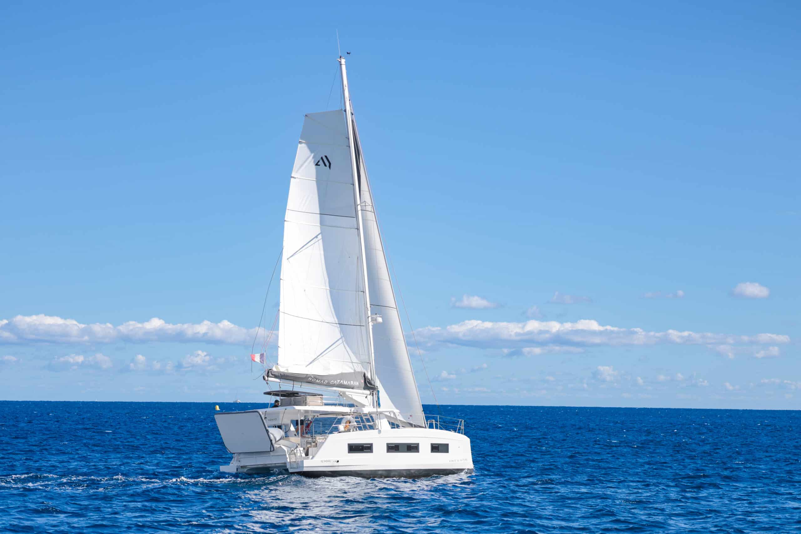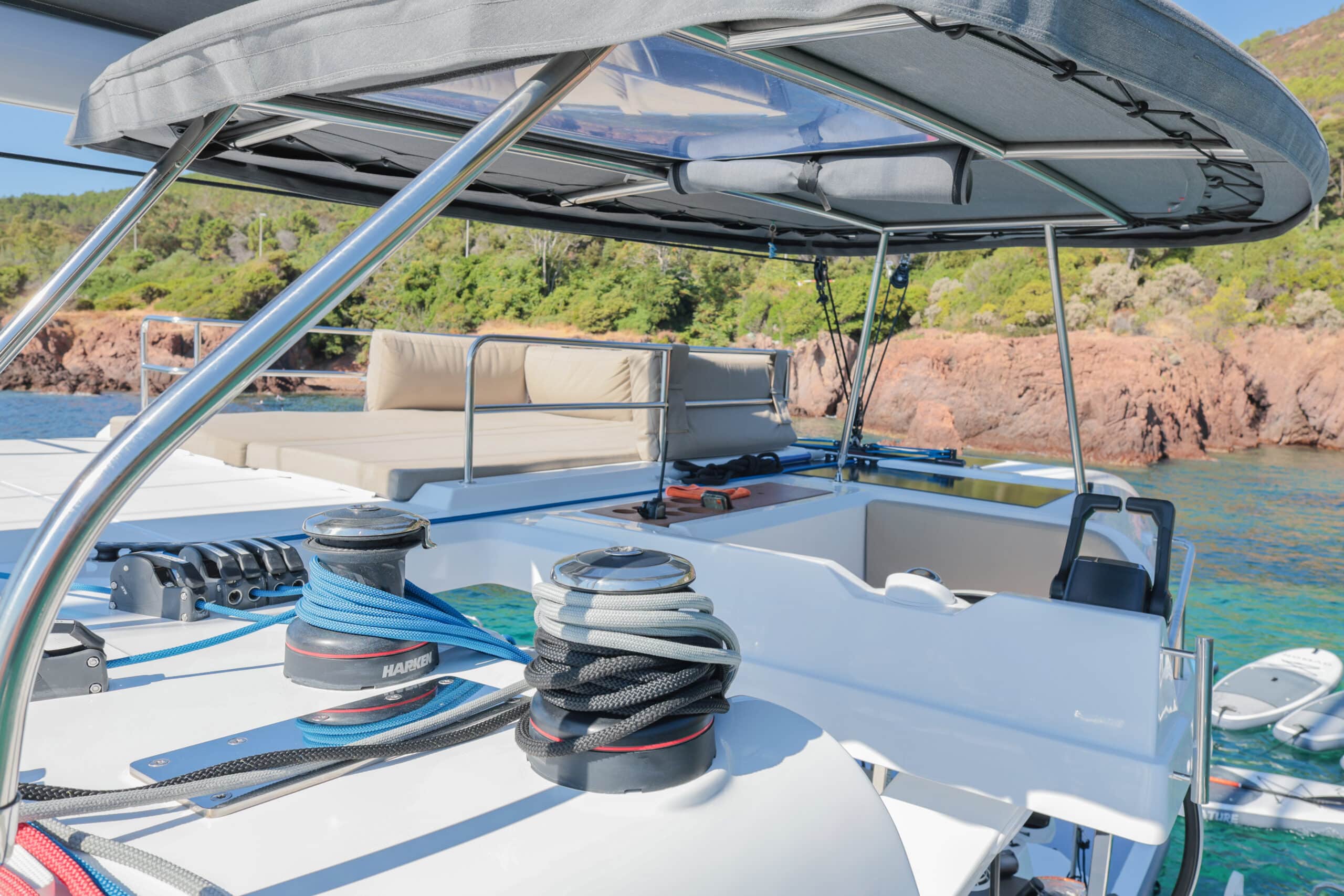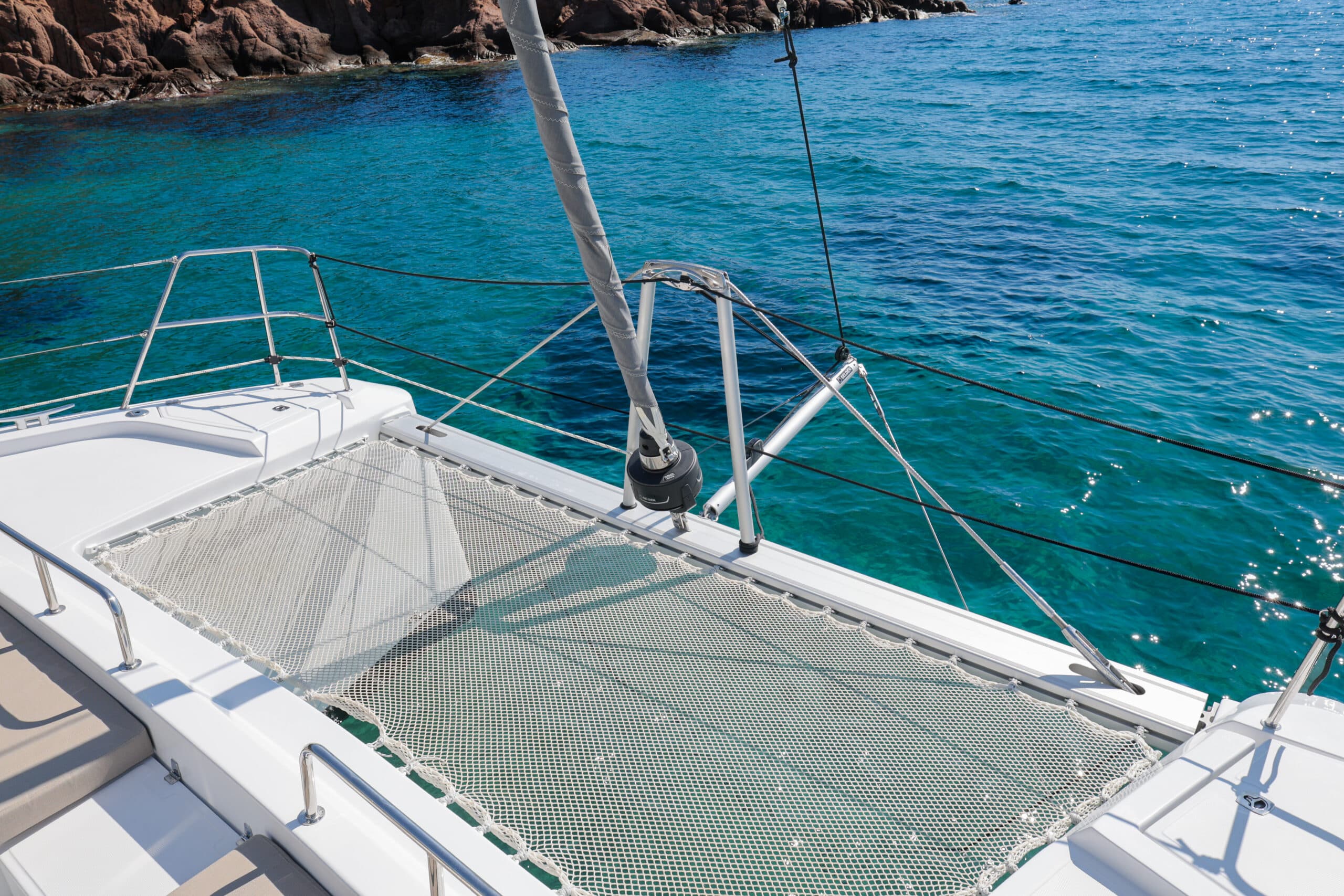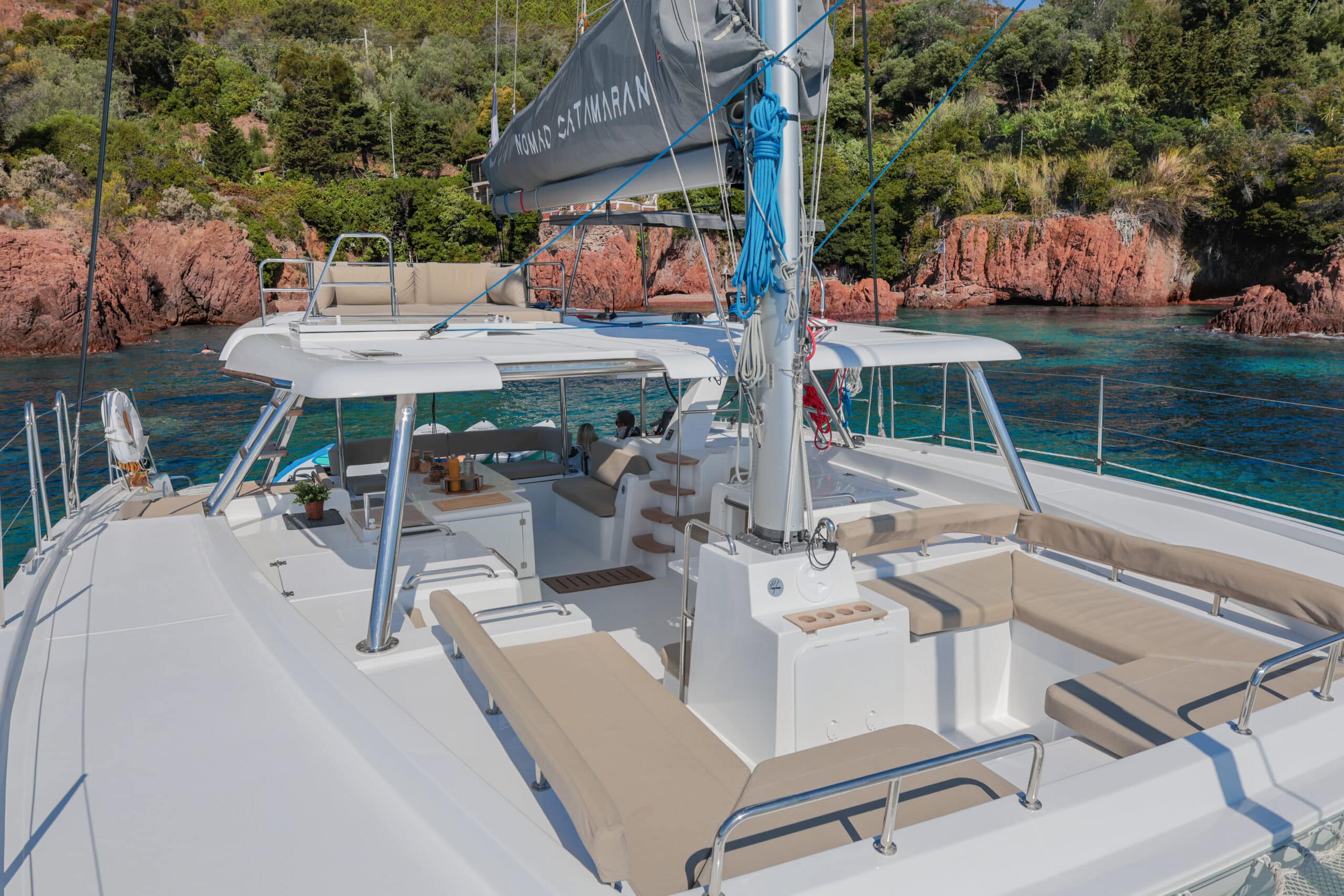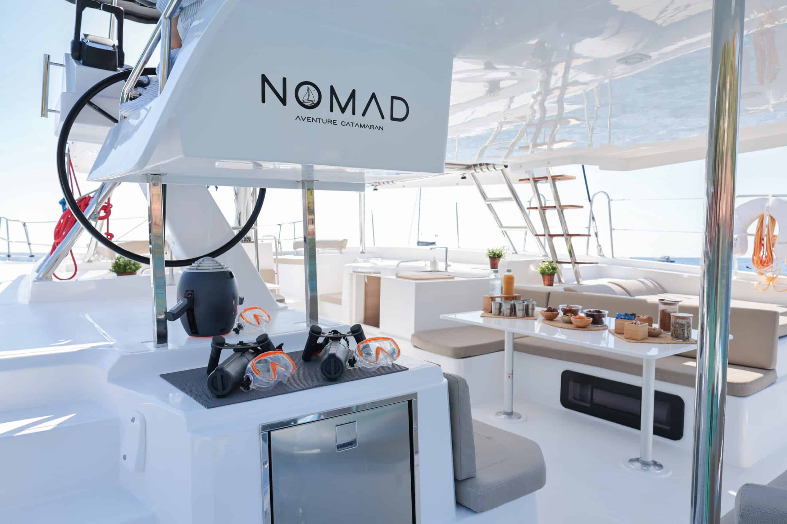 Catamaran à voile avec une conception « open deck » , plan de pont ouvert, muni d’un bar central nombreuses assises sur le pont, cuisine, grand frigo, toilettes, douches et cabines de change, coins repas, bains de soleil, filets, douchettes de pont, échelle de bain ainsi que de nombreux rangements clients. Un nouveau fly bridge ajoute un coin détente et un poste pour le barreur et les équipiers. On y retrouve également notre célèbre plongeoir. Possibilité de fermer à 360° en cas de mauvaise météo ou vent.