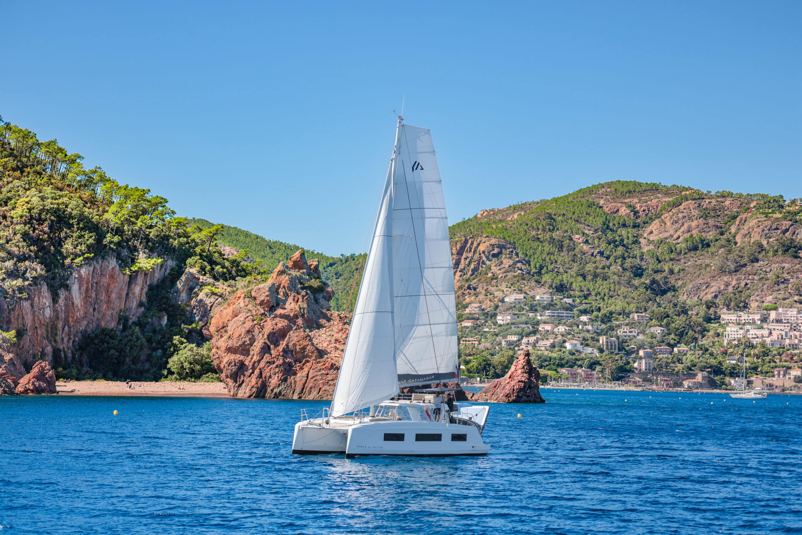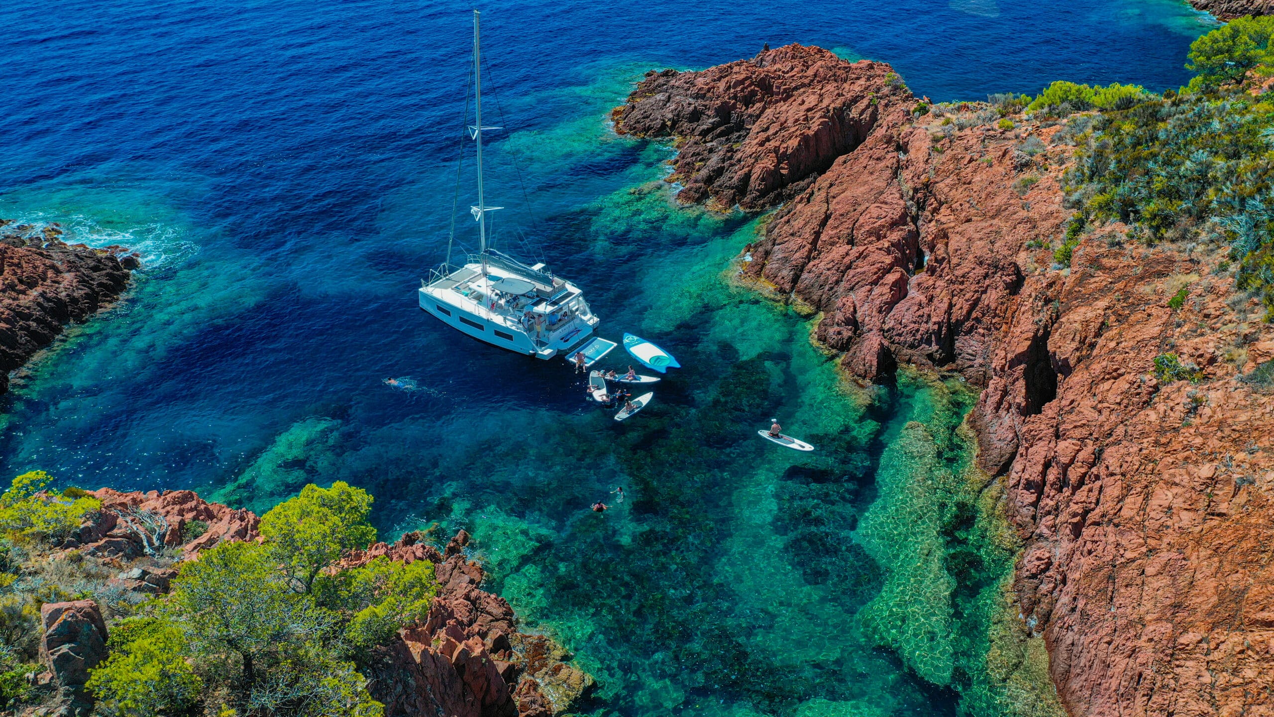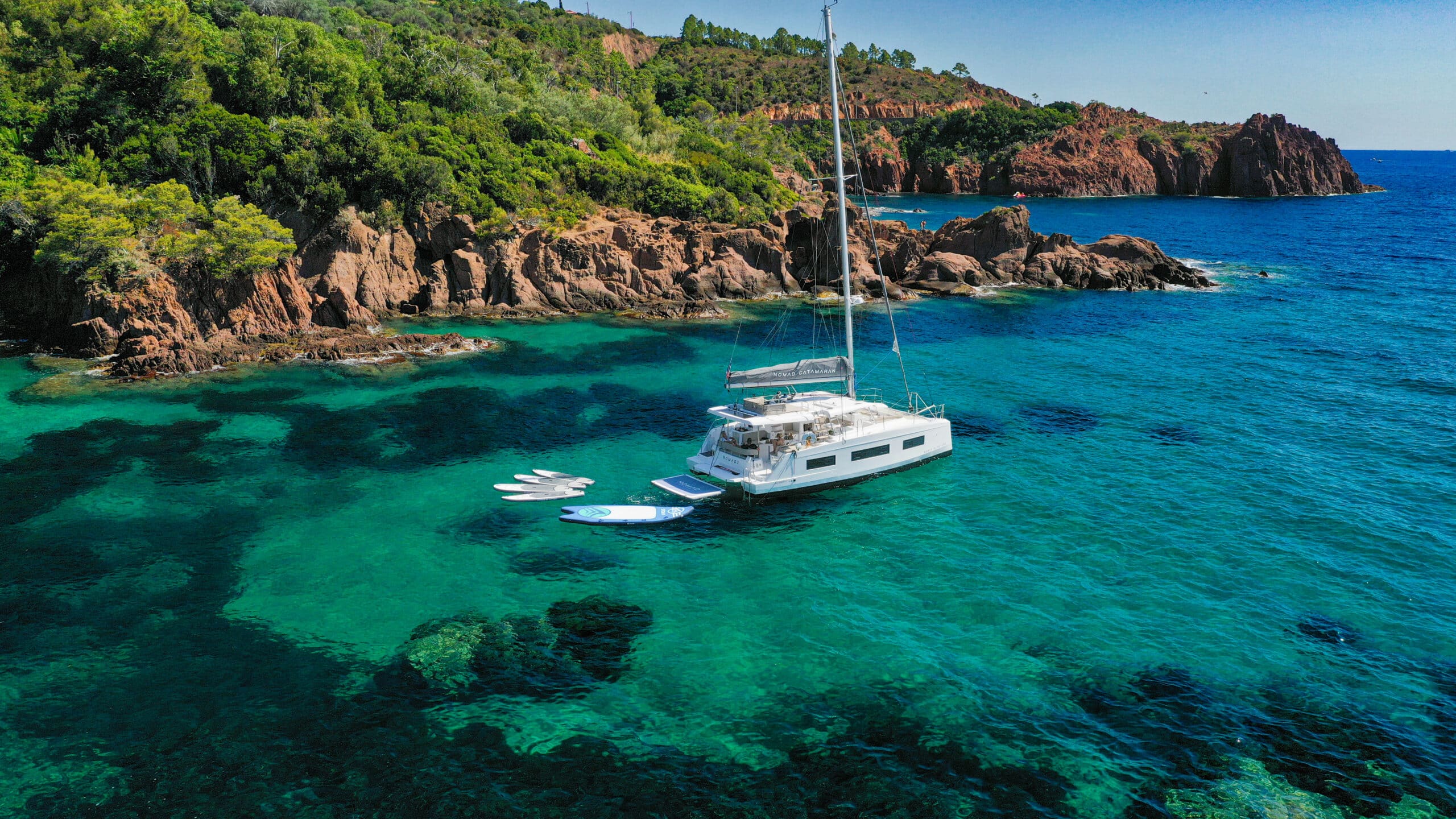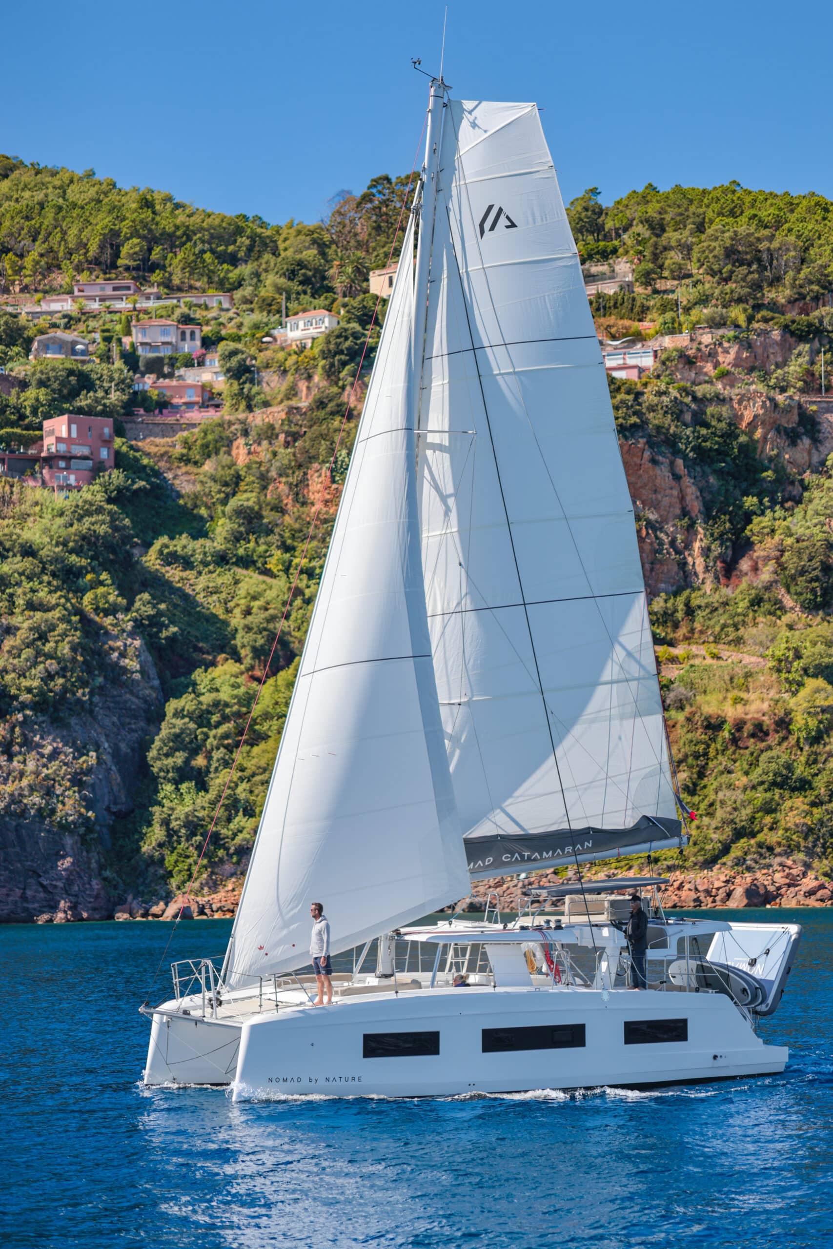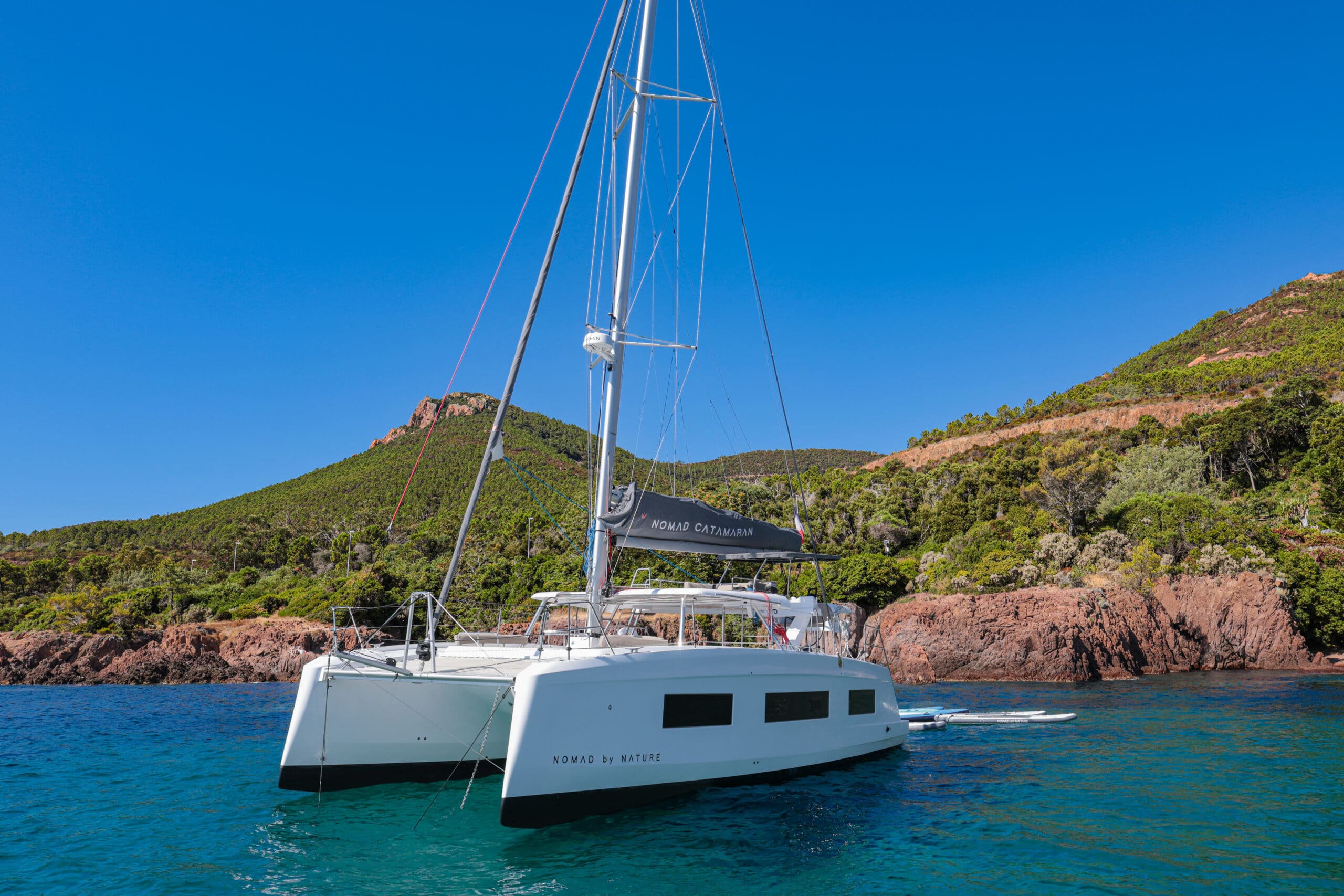 Catamaran à voile avec une conception « open deck » , plan de pont ouvert, muni d’un bar central nombreuses assises sur le pont, cuisine, grand frigo, toilettes, douches et cabines de change, coins repas, bains de soleil, filets, douchettes de pont, échelle de bain ainsi que de nombreux rangements clients. Un nouveau fly bridge ajoute un coin détente et un poste pour le barreur et les équipiers. On y retrouve également notre célèbre plongeoir. Possibilité de fermer à 360° en cas de mauvaise météo ou vent.